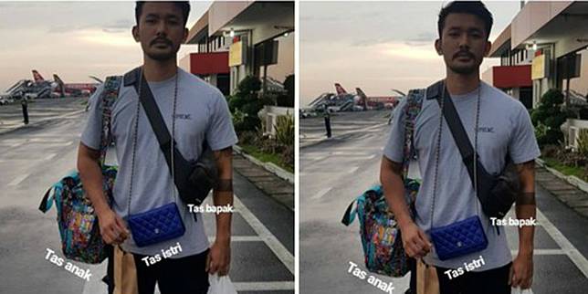 Sebagai ayah siaga, Rio tepergok membawa serentetan tas milik anak dan istrinya, Atiqah Hasiholan.