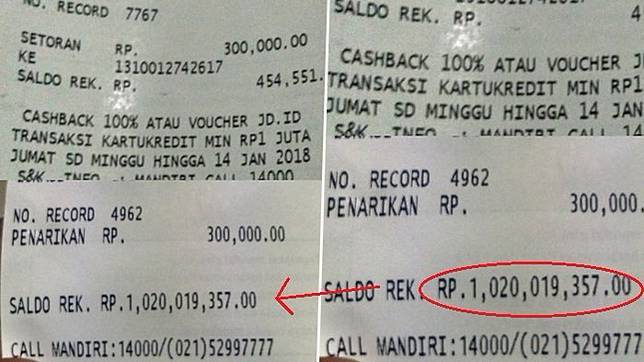 Struk pertama menyisakan saldo kurang dari Rp 500 ribu, sedangkan struk kedua menyisakan saldo Rp 1 Miliar.