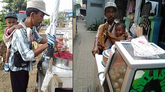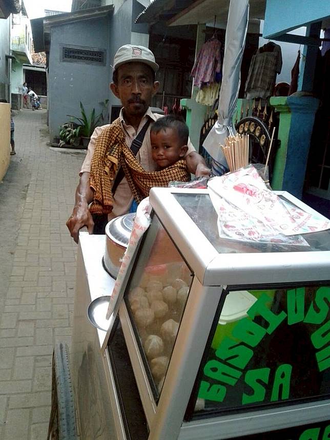 Sebuah foto yang merekam momen seorang pedagang cilok menggendong anaknya saat berdagang ini menjadi viral.