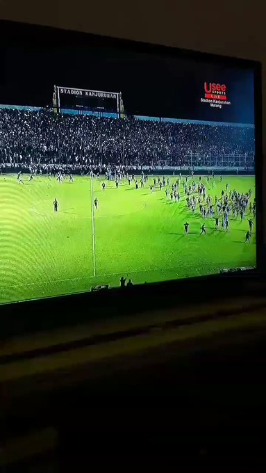 Pada menit ke-90, setelah suporter tim tuan rumah merengsek masuk ke lapangan sehingga pertandingan antara Arema dan Persib sempat dihentikan.